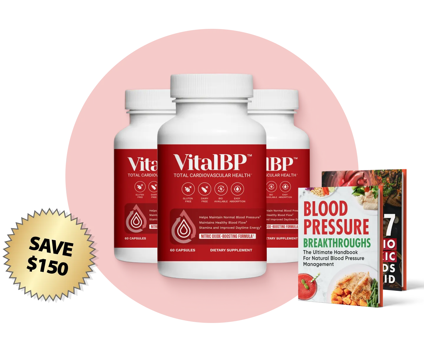 All-in-all, this careful, precise formulation along with our VitalBP System is designed to target the root cause of blood pressure issues so your heart can pump oxygen-rich blood through your arteries and all around your body, keeping your brain and vital tissues oxygenated, your joints nice and flexible, and fueling you with energy, all while reducing your worry of stroke and heart attack.
